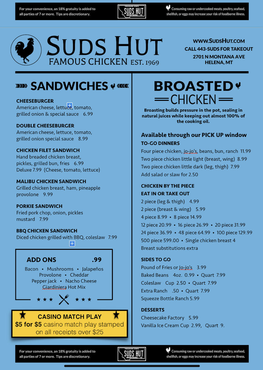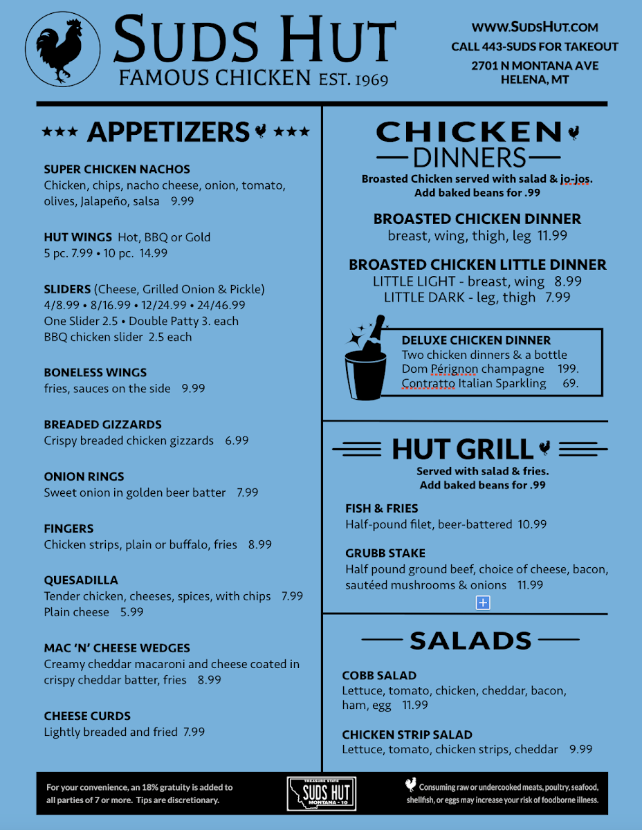 When you step into Suds Hut, you’re in for a treat that’s all about comfort and flavor. Located at 2701 N Montana Ave, Helena, MT, this local gem offers a menu that’s as inviting as the cozy atmosphere. From crispy, golden appetizers to hearty, filling mains, there’s something for everyone to enjoy. Whether you’re in the mood for a mouth-watering burger, a fresh salad, or something on the lighter side, Suds Hut Menu never disappoints.